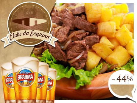 Sobre a oferta: 1(uma) Porção de Contra Filé (400g) + mandioca frita (400g) + 4 Chopps Brahma (300ml);